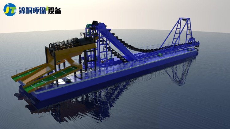 淘金船又稱采金船是一種在水中使用的集采礦作業、選礦作業為一體的水上聯合工廠,用于砂金礦的開采,包括挖掘系統、選礦及供水系統、廢礦及尾礦排棄系統、甲板機械、船體、上部鋼構、供電等幾個基本系統。